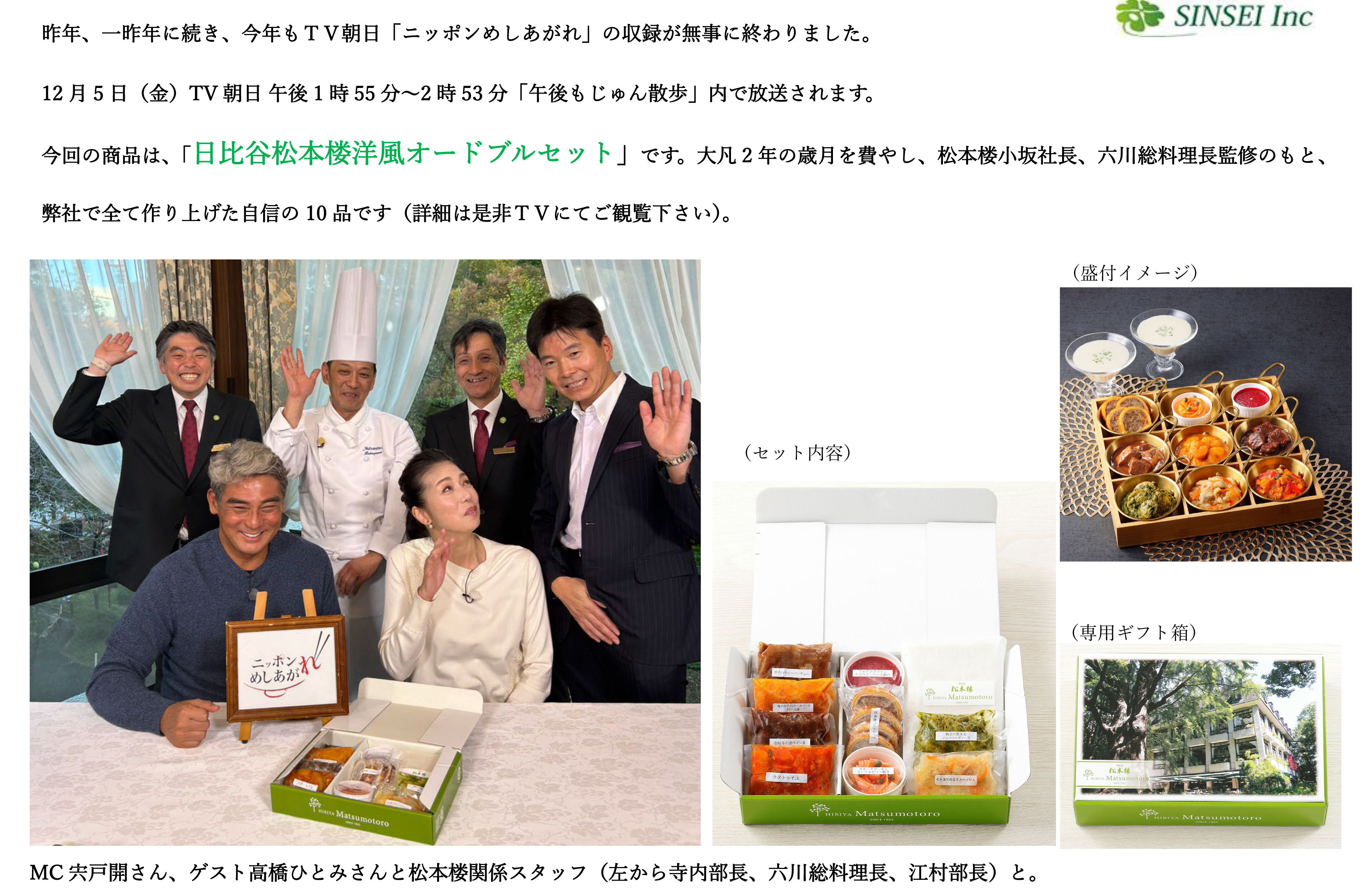 - TV朝日「ニッポンめしあがれ」にて弊社製造商品(松本楼洋風オードブルセット)を販売します。